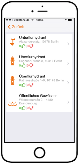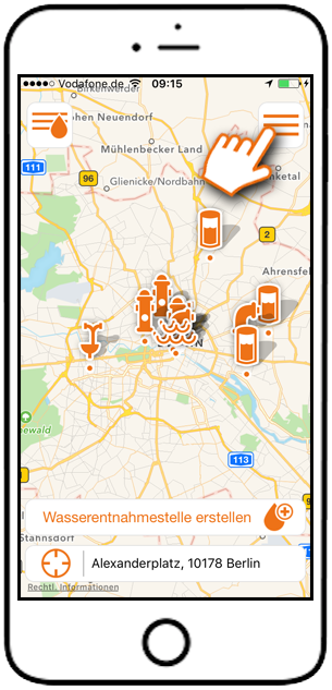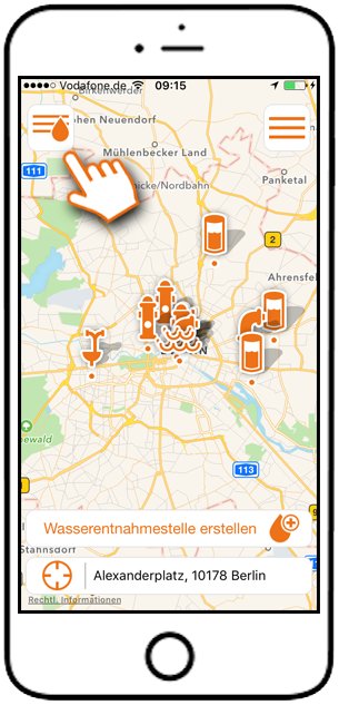 Lassen Sie sich in Ihrer direkten Umgebung Wasserentnahmestellen über ein Menü anzeigen.[/caption]