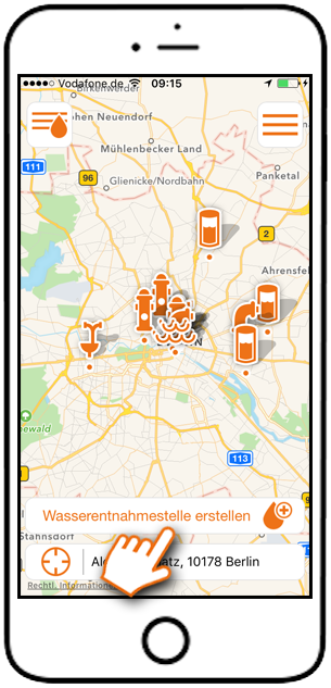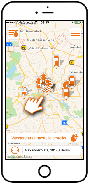 Auch beim Eintragen oder dem Bewerten von Wasserentnahmestellen ist eine aktive Internetverbindung erforderlich, da neue Informationen in eine Datenbank übertragen werden.