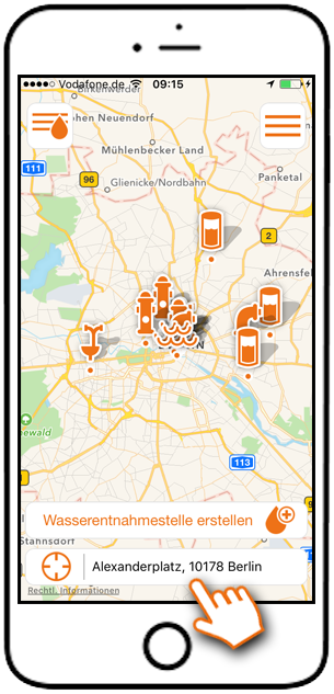 Verwenden Sie das Adressfeld, um Wasserentnahmestellen eines bestimmten Ort anzeigen zu lassen.[/caption]